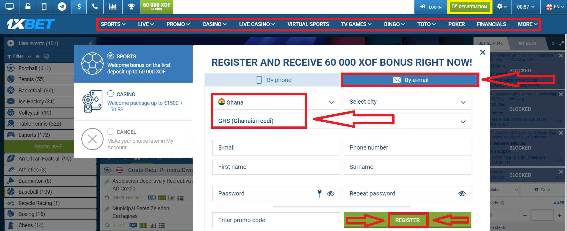 - Luncurkan aplikasi, daftarkan akun 1xBet baru, dan masukkan kode promosi COMPLETE1X.